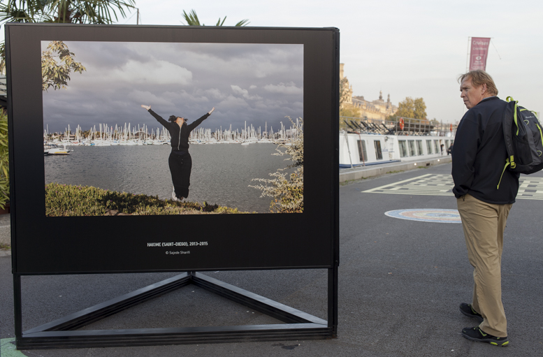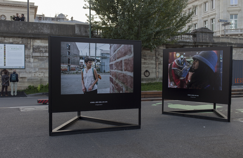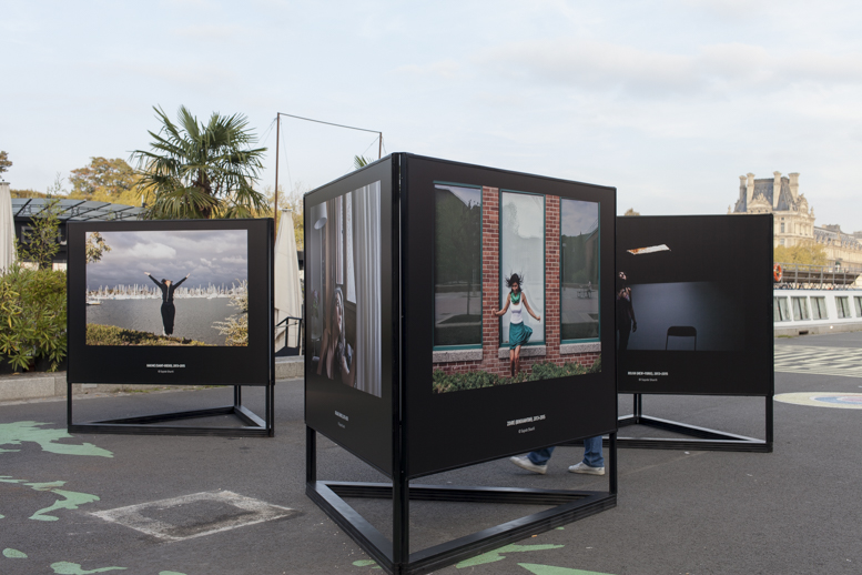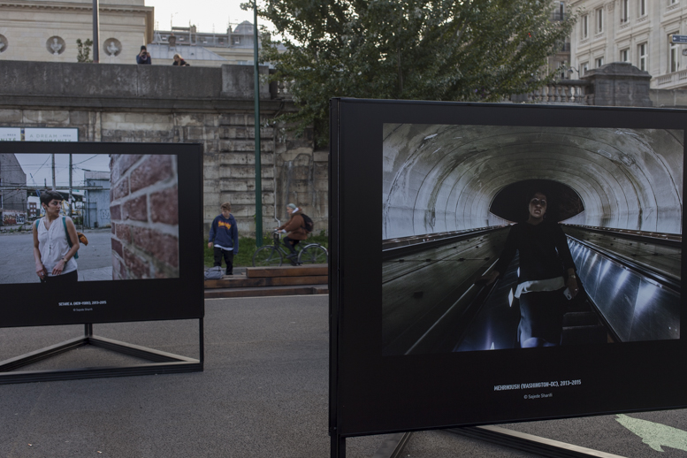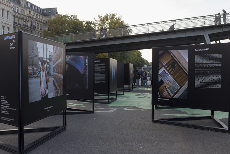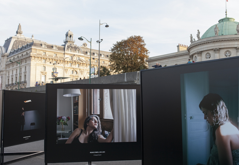 Migrantes, Vue d’exposition- GENRE PHOTOGRAPHIQUE / PHOTOGRAPHIE DE GENRE, Berges de Seine (Passerelle L.S.Senghor), Paris, 2015