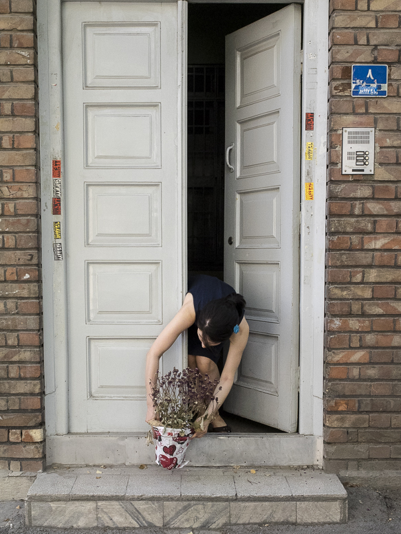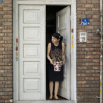 Elle met son voile à la sortie de chez elle pour le travail.